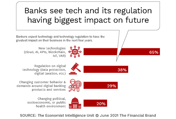 - 65% of financial institutions view new technologies as the biggest driver of change for the next four years, compared to 42% three years ago.