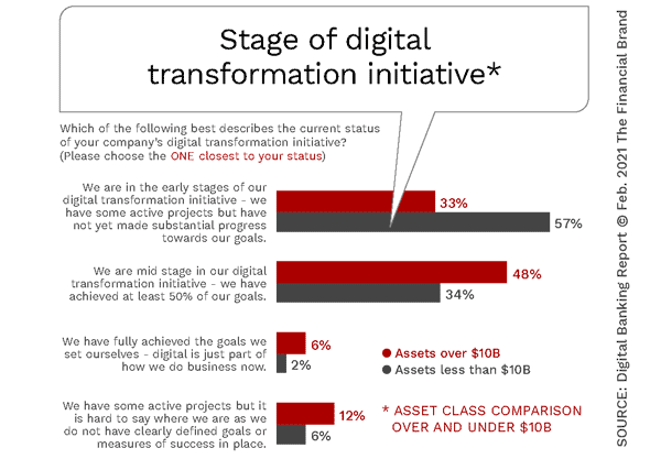 In research done by the Digital Banking Report, while the future trends and priorities mentioned by all financial institutions were very similar, regardless of the size of organization, there was a significant disparity in the progress made to become a more mature digital provider of financial services based on asset size. The research found that many organizations under $10B will be challenged to match the digital banking capabilities of their larger peers.