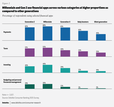 According to the Deloitte survey, millennials and Gen Z use financial apps at similar rates across payments, investing, budgeting and planning tools (see below). External research supports that convergence, with some data on U.S. banking habits showing younger generations clustering closely in digital usage patterns.